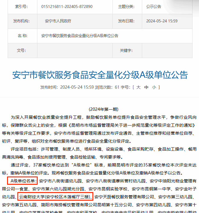 从现场检查情况来看,各食堂凭借规范的操作流程、完善的管理制度、优质的服务水平以及良好的食品安全保障能力,获得了评审专家组的认可与好评。A级餐饮服务单位是餐饮服务量化分级管理中的最高等级,此次检查不仅是对校区食堂餐饮服务工作的一次全面检验,更是推动安宁校区餐饮服务提质增效的重要契机。