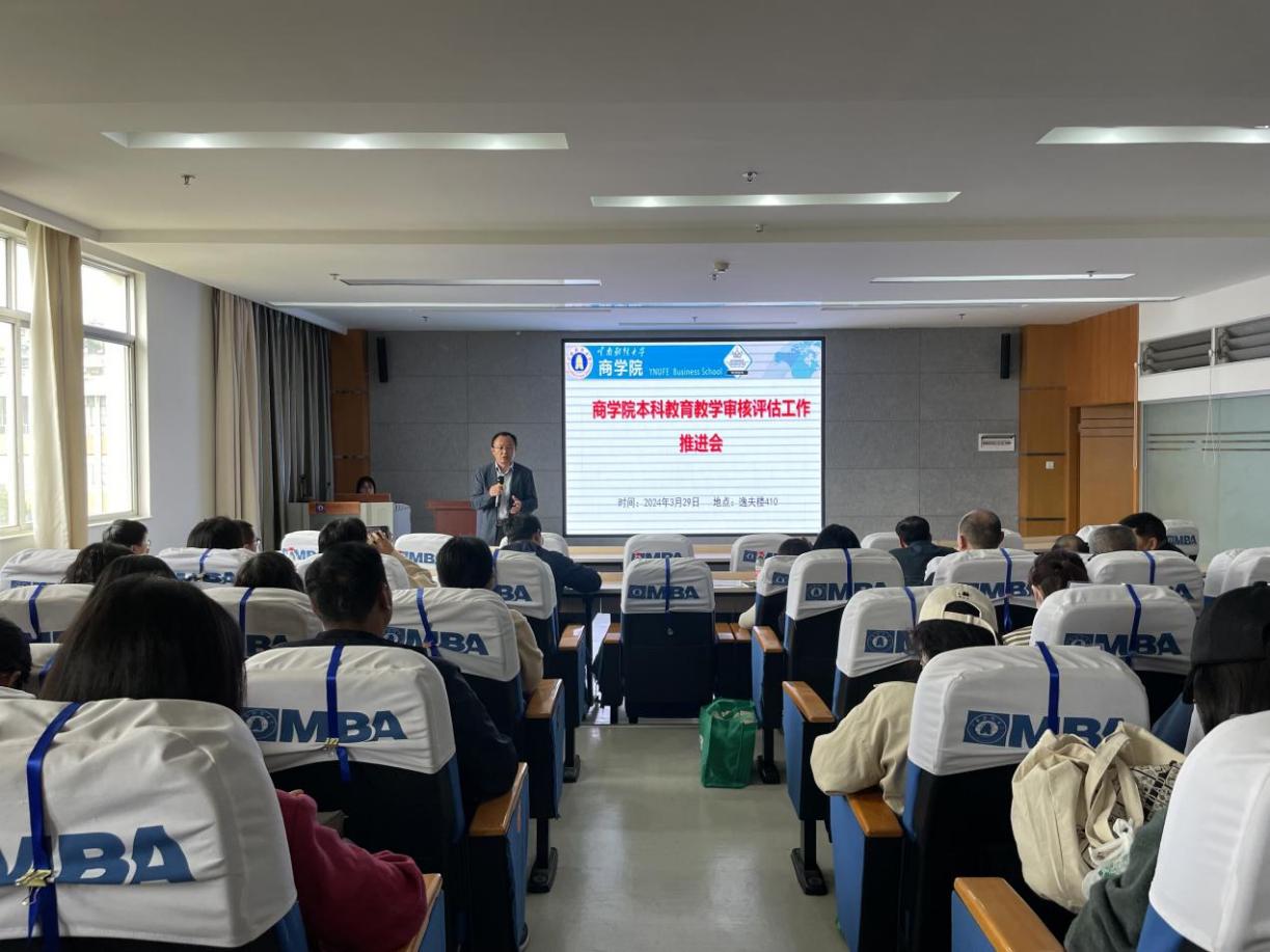 3月29日下午,商学院在逸夫楼410召开本科教育教学审核评估自评自建工作推进会,会议由商学院院长杨增雄主持,学院全体教职工90余人参会。会上,杨增雄院长再次强调了本次本科教育教学审核评估自评自建工作对于提升学院整体教学质量及教学水平的重要意义。随后,杨增雄提出了三点具体要求:一是全院上下要积极参与自评自建工作,认真查找存在的问题并及时整改;二是各科室要认真准备材料,为审核评估工作提供充分的数据支持和准备;三是各科室之间要加强沟通协作,形成合力,共同推动本科教育教学审核评估工作取得优异成绩,以凝聚起学院整体发展的强大动力。
