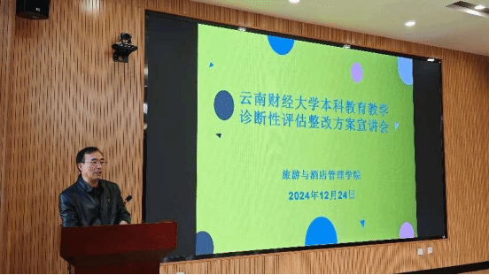 2024年12月24日,旅游与酒店管理学院在齐远楼220会议室召开了本科教育教学诊断性评估整改方案宣讲会。本次会议旨在深入贯彻学校关于本科教育教学审核评估工作的部署和要求,动员全院教师以饱满的热情和高度的责任感积极参与整改工作,确保整改任务高质量推进。会议由学院院长晏雄主持,学院党委书记李健,党委副书记李永祥,副院长谢洪忠、王智慧、李雪松及全体教职工参会。