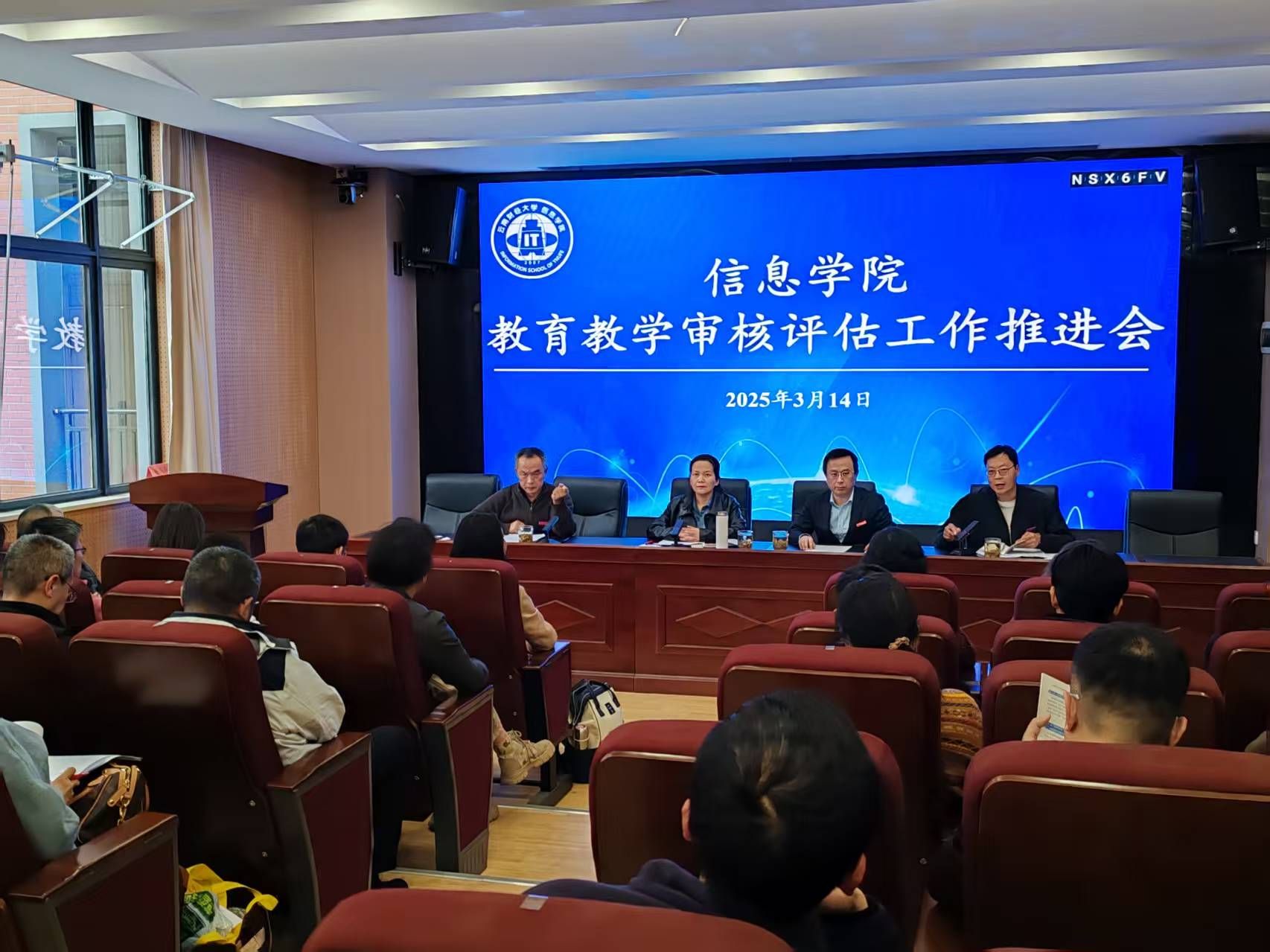 为推进本科教育教学审核评估工作,确保各项任务落到实处,2025年3月14日下午,信息学院在诚远楼305会议室召开本科教育教学审核评估工作推进会。会议由学院党委书记李娟主持,副院长徐兴贵、赵成贵、姜茸,各系主任及全体教师参会。