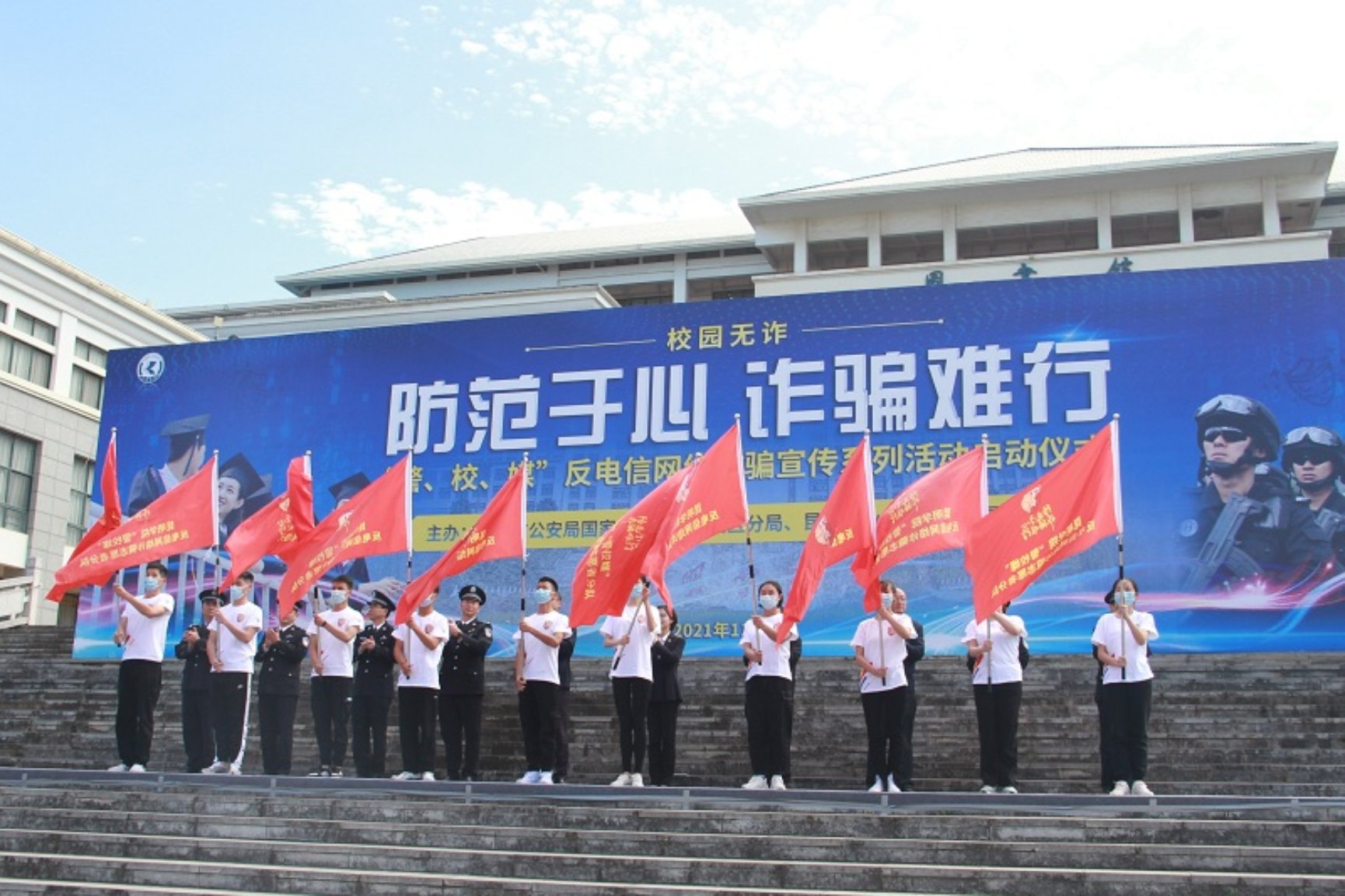 启动仪式上,徐云向广大师生和民警发布“反诈宣传”动员令,金幼和宣布“警、校、媒”反电信网络诈骗宣传系列活动启动,与会领导向昆明学院反电信网络诈骗志愿者分队授旗,1000余名反电诈学生志愿者集体宣读倡议词,决心绷紧安全之弦,投身反电诈宣传,共建平安校园。活动现场,昆明学院组织学校师生通过设计反电诈文创产品、手绘文化墙、手绘校园海报等形式,发动广大师生学习宣传反电诈知识。昆明警方通过发放《全民反诈宣传手册》、张贴海报、悬挂标语、摆放展板、发放反电诈文创产品、开展法律知识咨询等形式,推广“金钟罩”反诈小程序、国家反诈中心App,向全体学生传授防电诈的实用技巧。
