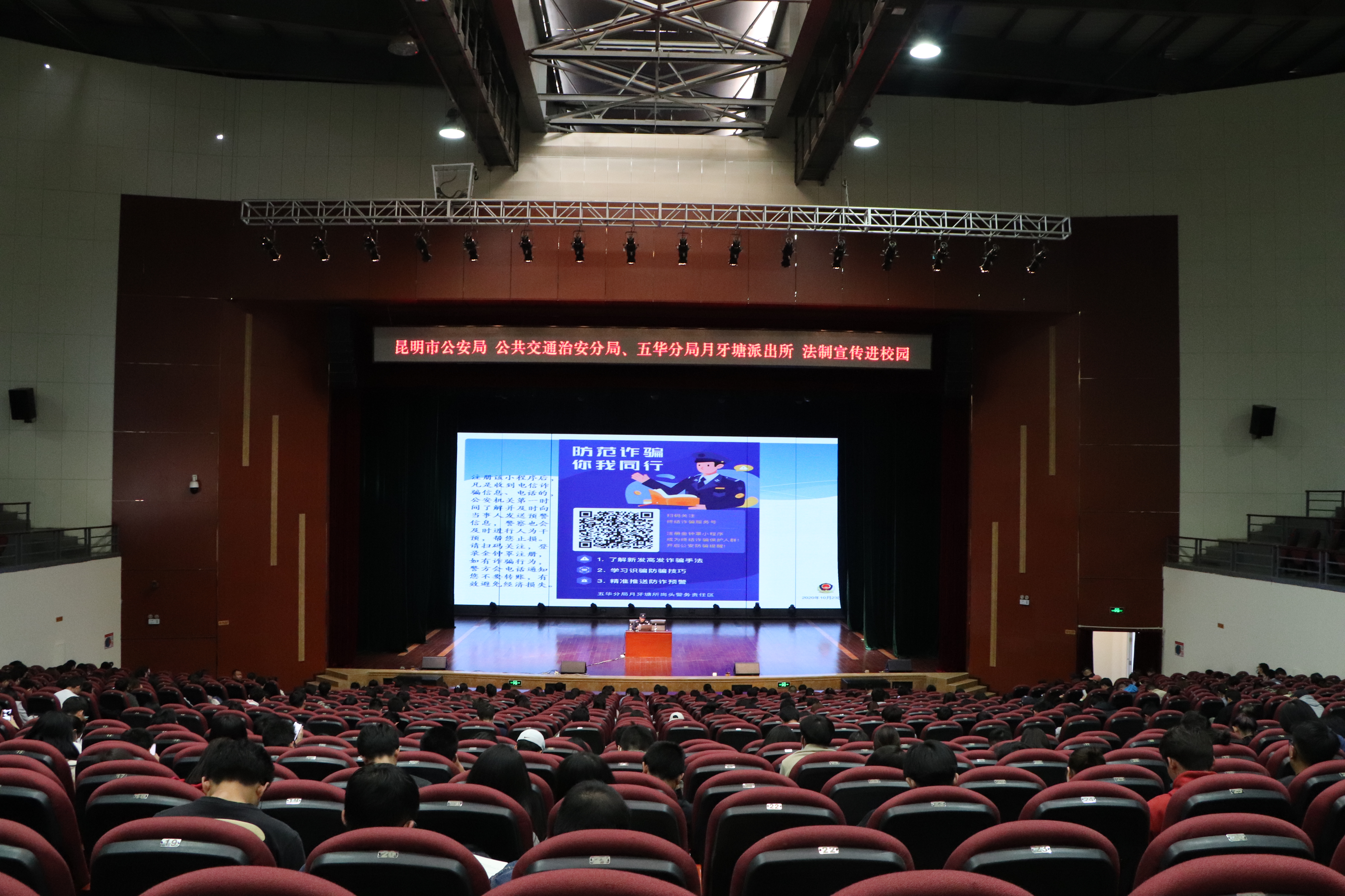 为增强学生学法、知法、守法的法治观念和安全防范意识,10月23日下午,昆明市公安局五华分局月牙塘派出所和公共交通治安分局民警应邀到校开展法制教育活动。活动由学校保卫处处长施航天主持,各学院分管学生工作的领导、学生科科长、辅导员、机关二十支部全体党员和各学院学生代表约400人参加。