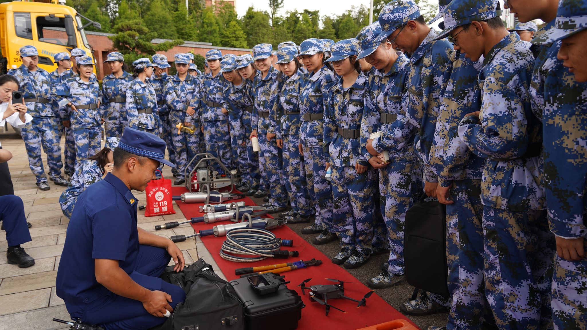 消防员教官现场展示了抢险救援服、灭火防护服、金属切割机、液压破拆工具组、救生气垫等常用装备的功能与适用场景,并演示了灭火器的规范操作。同学们积极参与实操环节,亲手体验各类器械,演练扑灭初期火情,进一步巩固所学知识和技能。