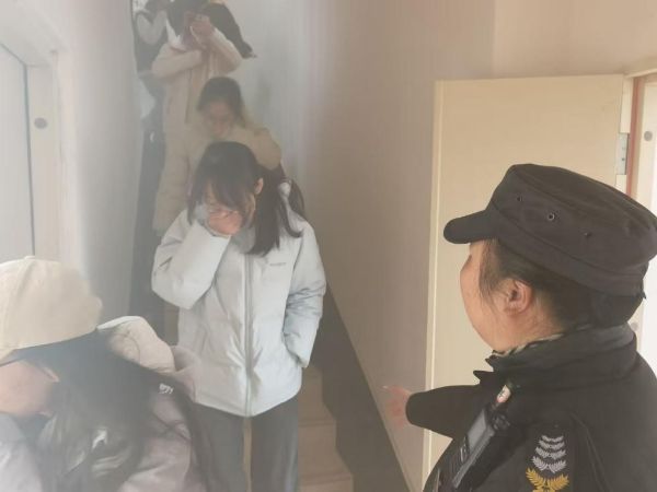 演练当日,随着模拟火灾警报信号响起,演练正式启动。悦华3幢宿舍内的学生在现场工作人员的引导下,用湿毛巾捂住口鼻,弯腰低姿,沿着预定疏散路线快速、有序地向楼外安全区域撤离。与此同时,罗白派出所民警、校园安保人员、后勤保障人员及各学院工作人员各司其职,分别开展秩序维护、疏散引导、应急警戒等工作,全程保障疏散通道畅通。