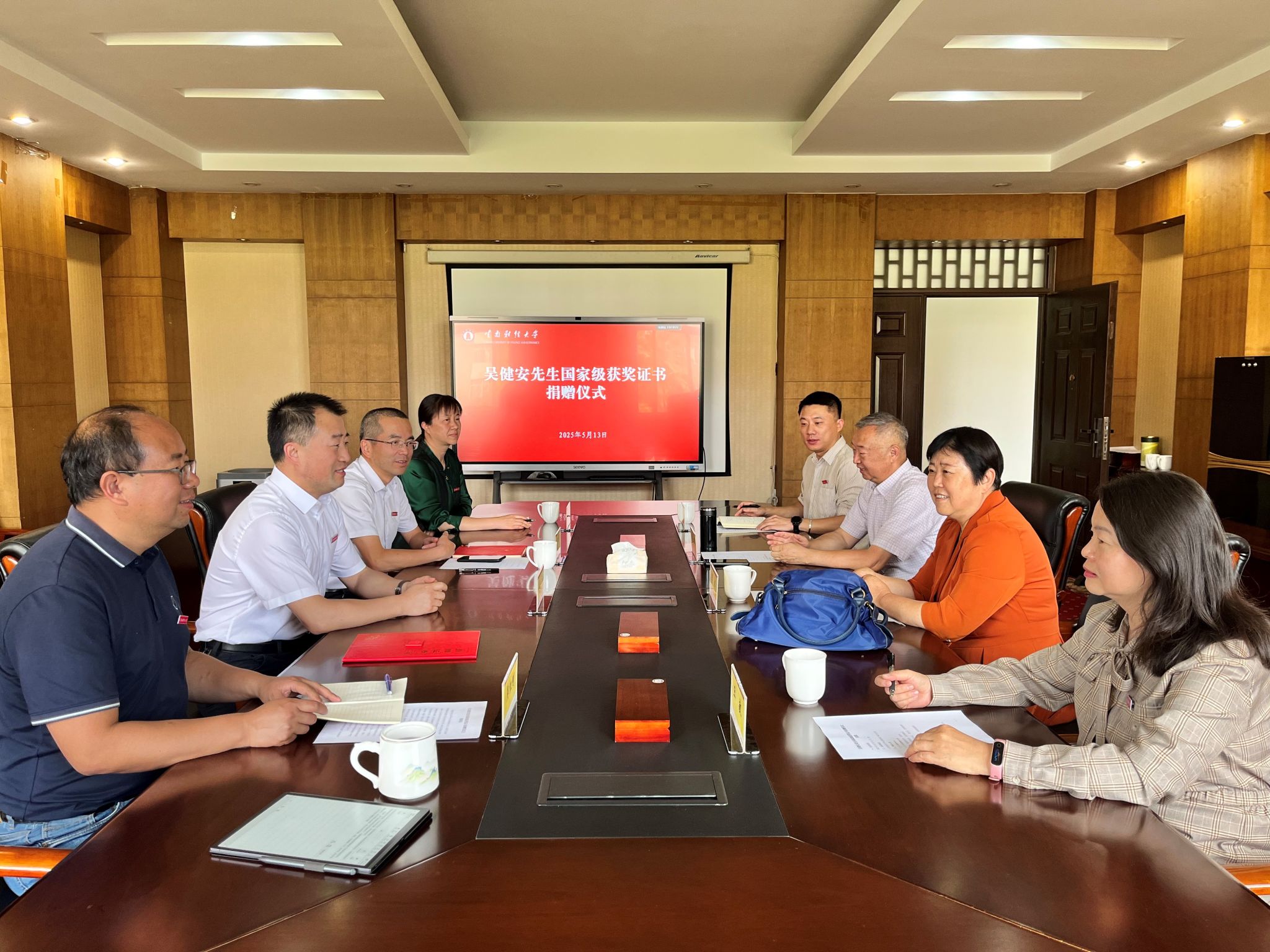 2025年5月13日下午,吴健安先生国家级教学成果奖获奖证书捐赠仪式在致远楼402会议室举行。吴健安先生之女吴玲女士将其父2005年荣获的国家级教学成果奖证书(获奖成果:市场营销学课程立体化教材建设)捐赠学校。校党委委员、副校长余怒涛,校党委委员、宣传部部长寸丽锋,商学院党委书记王敏,商学院教授聂元昆,评估中心副主任崔海浪,档案馆馆长吴红刚,副馆长王志梅等出席仪式。