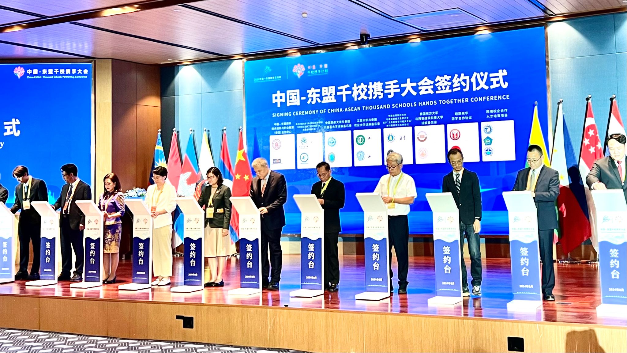 在“中国-东盟千校携手大会”活动现场,WilliamHill官方网站作为14所代表院校之一,与合作方泰国碧差汶皇家大学共同上台参加签约仪式。