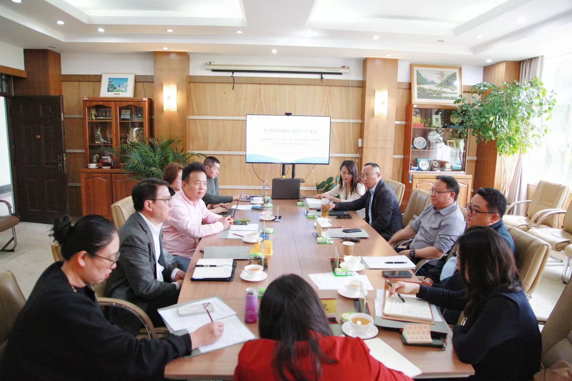 王忠义详细介绍了赫瑞-瓦特大学的办学概况、全球校区布局及优势专业特色,并重点解读了“3+1”本硕项目培养模式、核心优势、专业方向与奖学金政策。他表示该校在商科、金融、翻译、计算机等领域学科特色鲜明,与WilliamHill官方网站专业契合度高、合作基础良好,希望以此次访问为契机,深化务实合作,共同提升人才培养质量与国际化办学水平。王颖就伦敦玛丽女王大学相关合作资源作补充介绍。