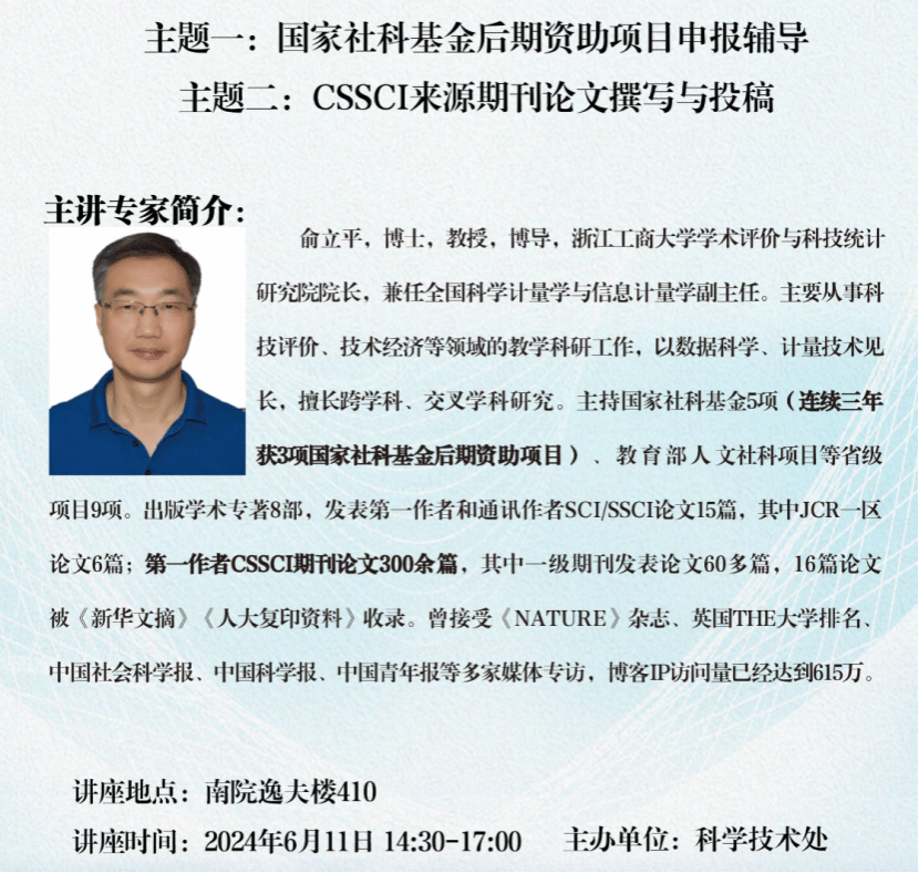 Yu Liping, Ph.D., is a professor and doctoral supervisor, currently serving as the Director of the Institute of Academic Evaluation and Science and Technology Statistics at Zhejiang Gongshang University. He also serves as the Deputy Director of the National Science and Technology Metrics and Information Metrics Committee. Prof. Yu specializes in the fields of scientific evaluation and techno-economics, with a strong focus on data science and metrics techniques. He excels in interdisciplinary and cross-disciplinary research. Prof. Yu has led five National Social Science Fund projects (securing three consecutive post-funded projects), nine provincial-level projects including those funded by the Ministry of Education's Humanities and Social Sciences projects. He has published eight academic monographs and authored 15 SCI/SSCI papers as the first author or corresponding author, including six papers in JCR Q1 journals. He has also published over 300 CSSCI journal papers as the first author, with more than 60 papers in top-tier journals. Sixteen of his papers have been included in Xinhua Digest and China Social Science Excellence. Prof. Yu has been interviewed by numerous media outlets, including NATURE, THE (Times Higher Education), Chinese Social Sciences Today, Science and Technology Daily, and China Youth Daily. His blog has reached 6.15 million IP visits.