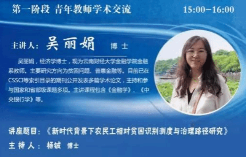 Dr. Wu Lijuan holds a Ph.D. in Economics and is currently a teacher in the Department of Finance at the School of Finance, Yunnan University of Finance and Economics. Her main research areas include poverty issues and inclusive finance. Dr. Wu has published several academic papers in journals indexed by CSSCI and has led or participated in multiple national and provincial-level projects. She teaches courses such as Finance and Central Banking.