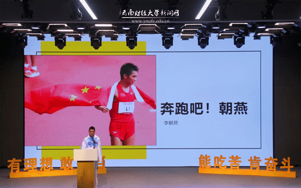 “我深知人生需要奋斗,成功需要拼搏,正是因为我一直在努力奔跑,我的愿望我的期盼才成为了现实。”李朝燕讲述了他从云财学子到马拉松冠军再到云财教师的故事。从小身体残疾的他在一路奔跑的历程里懂得了“拼搏”“奋斗”和“坚持”的意义,也在这个过程当中一步步实现了理想。李朝燕表示,青春由磨砺而出彩,人生因奋斗而升华。“我想用自身经历去告诉每一个人,只有拼搏才能打破桎梏、走出暗淡;只有奋斗才能不负青春、不负韶华。”