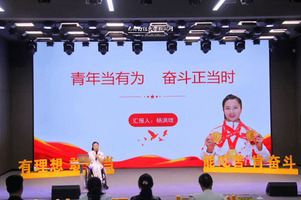 杨洪琼以“青年当有为、奋斗正当时”为题进行了分享交流。作为曾经的国家残奥越野滑雪运动员、北京冬残奥会的“三冠王”,到如今曲靖市纪委监委清廉曲靖融媒体中心的一名主持人,再到圆梦大学校园的学生,对于只能坐在轮椅上生活的杨洪琼来说,每一次的身份转变都是一次涅槃重生。她以自己的经历书写了精彩与奇迹,也以自己的人生故事与师生分享“不屈服于命运,努力拼搏、突破自我”“不断积累,抓住机会、创造奇迹”“心怀感恩,珍惜当下、不懈奋斗”的体会与感悟。