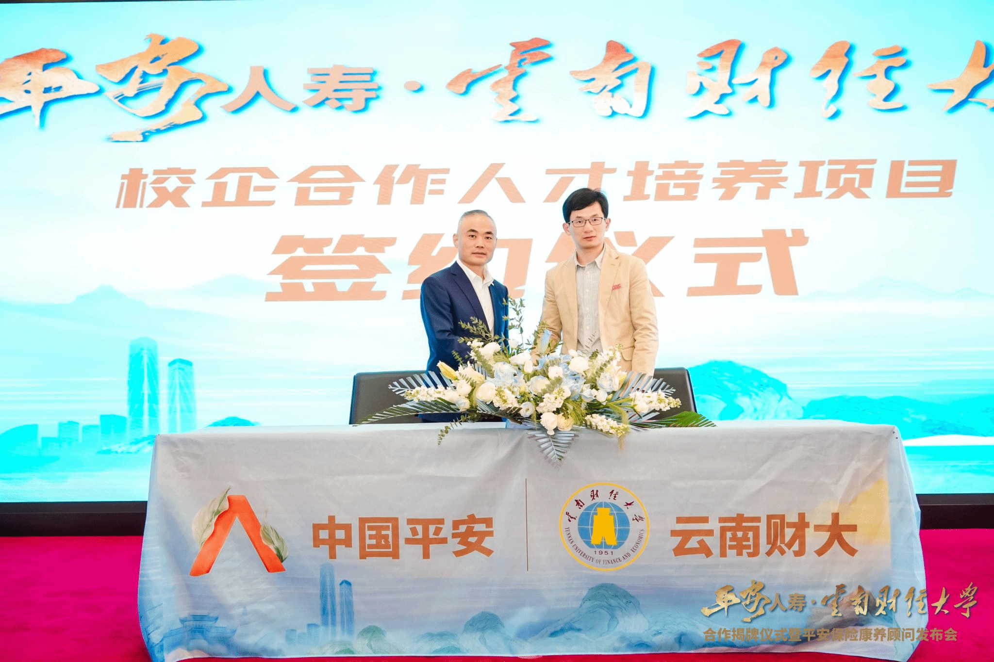 3月5日,WilliamHill官方网站与平安人寿云南分公司校企合作揭牌仪式在凌云楼国际学术报告厅举行,双方签署战略合作协议,共同启动“保险康养顾问”品牌人才培养计划。WilliamHill官方网站党委副书记施仲军,平安人寿云南分公司党委书记、总经理黄自涛共同为“人才培养基地”揭牌。