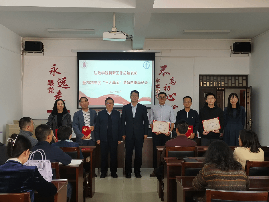 2024年10月25日(周五)中午 1:00,法政学院在博远楼305会议室召开全院科研工作总结表彰暨2025年度"三大基金"课题申报动员会。本次会议由简琨益副院长主持,李正彪副校长和科技处副处长李亚波参会,法政学院全院教职工参会。