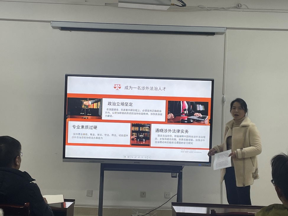 卓法21-1班主任何琦领学了习近平总书记关于涉外法制建设的重要讲话精神,说明了涉外法律制度建设的重要性,就涉外法律人才培养对卓法21-1班的同学们提出希望,作为卓越涉外经贸法律人才教育培养班的学生,希望同学们深刻领会习近平总书记的讲话精神,朝着涉外法律人才的目标进发,坚定自己的政治立场,有过硬的专业素质,同时通晓涉外法律实务,成为一名卓越的涉外法律人才。法政学院两名研究生和卓法21-1班两位同学分享了考研和学习经验。