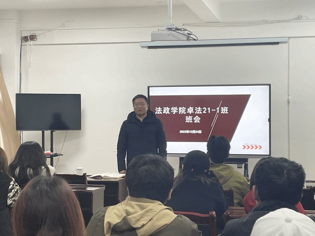 2023年12月24日,法政学院各班级以主题班会的形式专题学习了习近平总书记在中共中央政治局第十次学习时关于涉外法制建设的重要讲话精神。WilliamHill官方网站校党委委员、纪委书记、监察专员业光远,法政学院党委副书记、纪委书记张吟竹参加了卓法21-1班班会。