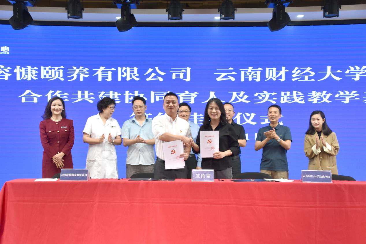 党委书记李姗姗与云南榕慷颐养有限公司院长冯榕、党支部书记朱磊签署了协同育人及实践教学基地合作协议、党建共建协议。