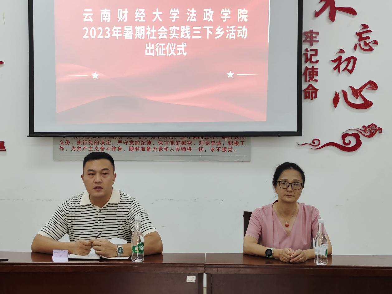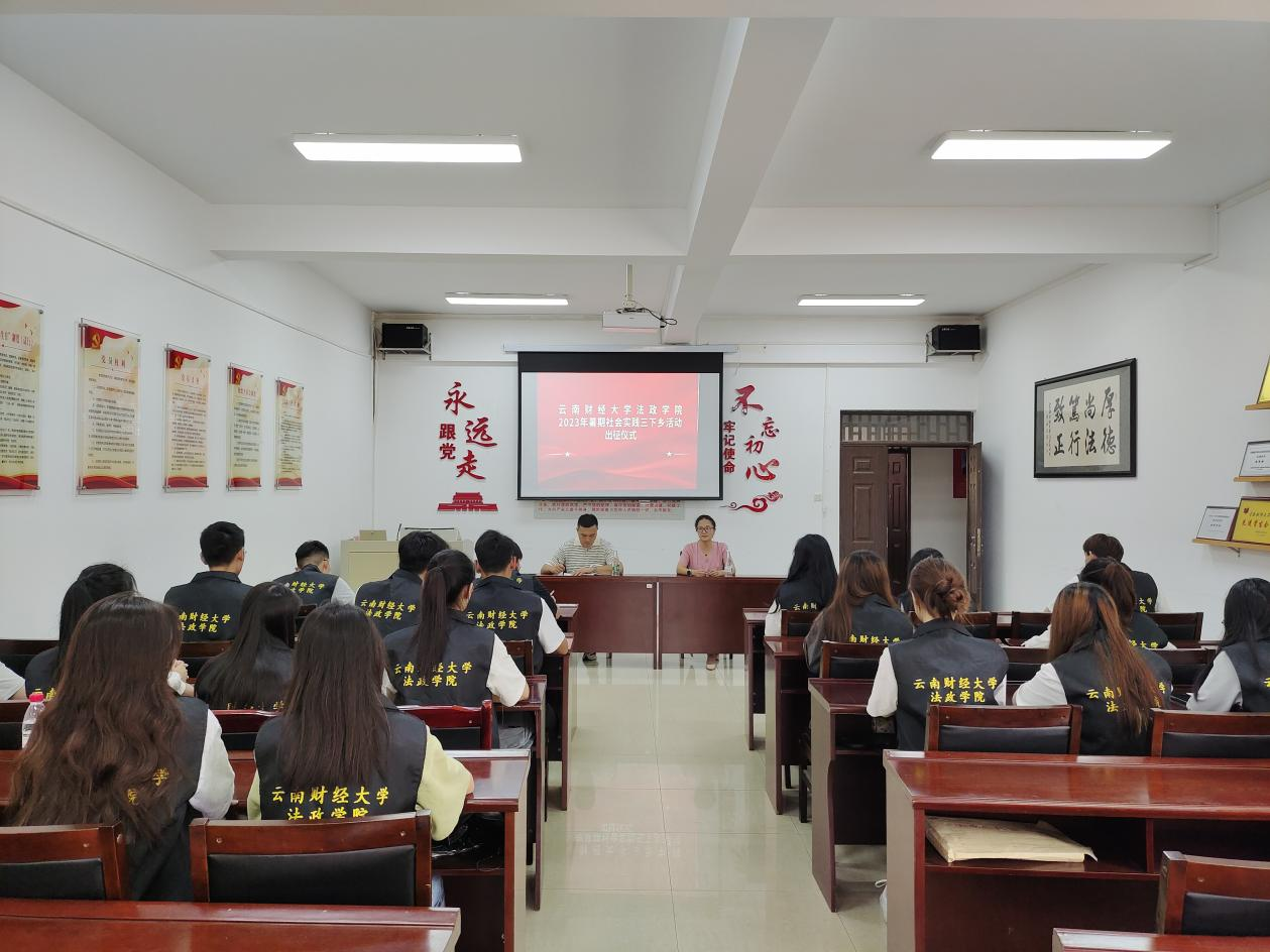 为深入学习贯彻党的二十大精神,帮助云财法政青年在实践中坚定理想信念,成为立大志、明大德、成大才、担大任的新时代大学生,法政学院团委积极组织开展2023年暑期三下乡社会实践活动。7月10日,法政学院团委于博远楼305开展2023年暑期三下乡社会实践动员指导会暨出征仪式,法政学院党委书记李姗姗、院长石现明、党委副书记张吟竹、团委书记李浩及三下乡社会实践队学生代表出席本次活动。