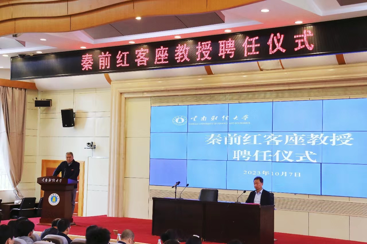 2023年10月7日,学校在国际学术报告厅举行客座教授聘任仪式,王敏校长为武汉大学秦前红教授颁发聘书并致辞。聘任仪式由法政学院院长石现明主持。