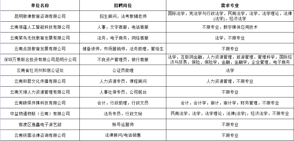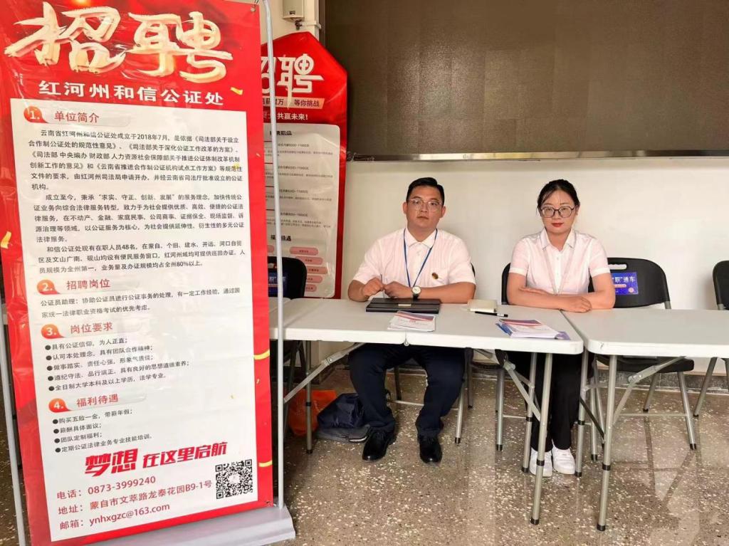 为全力做好2023届毕业生就业工作,落实访企拓岗促就业工作要求,6月30日下午,法政学院在龙泉校区北院众创空间一楼大厅举办“周五‘职通车’”专场招聘活动。云南省红河州和信公证处、云南点拨教育发展有限公司等12余家企业参加了本次活动。