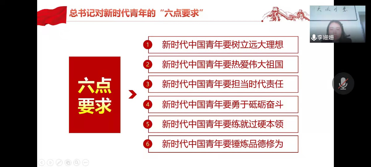 李姗姗老师首先讲述了习近平总书记对新时代青年的六点要求,希望同学们都能够按照这些要求提升自己。接着,她向同学们提出了青年大学生的四个目标,分别是坚定远大理想、勇挑时代重担、坚持踏实躬行、矢志艰苦奋斗。“坚定伟大理想”,希望大家以抗日先辈、北京大学援鄂医疗队等榜样为奋斗目标,胸怀祖国,艰苦奋斗。“勇挑时代重担”,告诫个人理想只有与国家民族的前途和命运相结合才能得以实现。“坚持踏实躬行”,倡导同学们学习外卖小哥汪勇和袁隆平团队为实现理想努力奋斗的精神。“矢志艰苦奋斗”,让同学们明白中国梦是国家的,是民族的,也是每一个中国人的,我们要始终坚持奋斗,努力实现中华民族伟大复兴的中国梦。