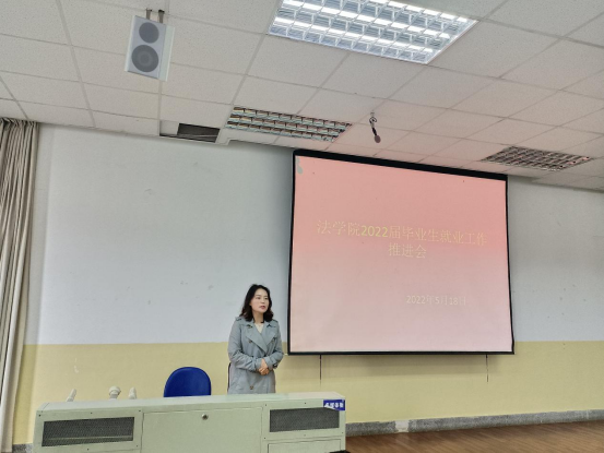 为认真贯彻落实《学校2022届毕业生就业“百日冲刺”专项行动实施方案》相关要求,深入推进法学院2022届毕业生就业创业工作,2022年5月18日下午3时,法学院在凌云楼南附301召开2022届毕业生就业创业工作推进会。法学院党委书记李姗姗给全体毕业生做《2022年毕业生就业形势分析、研判及应对》专题讲座,党委副书记王俊对就业信息填报相关要求、三方协议签订等做具体指导。法学院2022届毕业班班主任、全体毕业生参加会议。
