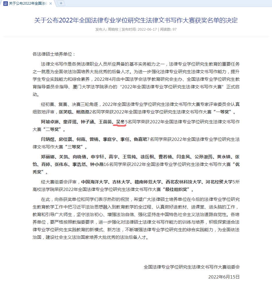法律文书写作大赛是目前唯一的全国性法律硕士研究生实践技能赛事。该大赛对各高校重视法律硕士实践能力培养,创新法律硕士人才培养模式具有引领、推动作用。今后我院将继续重视法学生专业实践能力的培养,拓宽法学生实践能力提升渠道,激励学生积极参与各类法学专业竞赛活动。