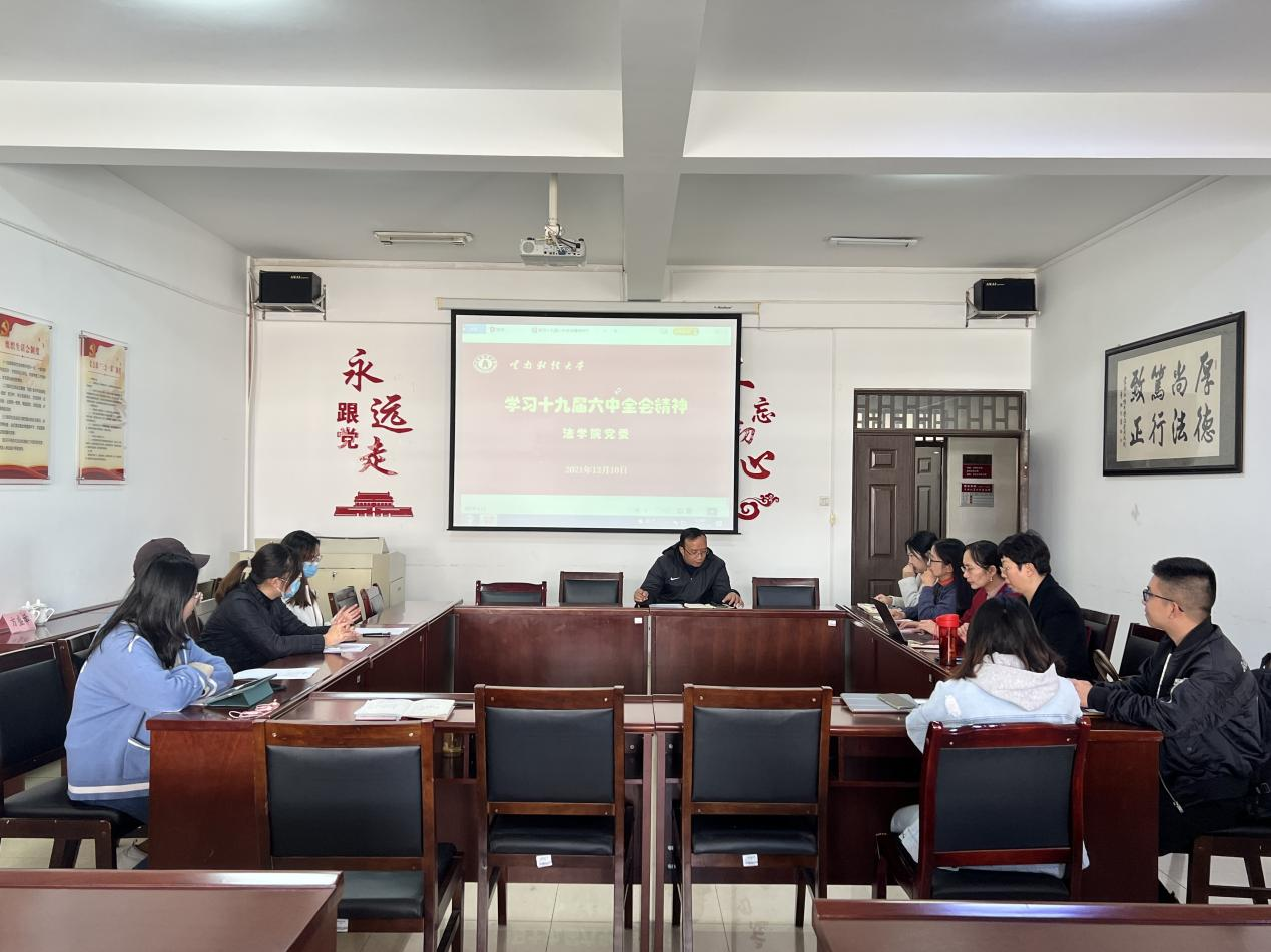 为认真学习贯彻党的十九届六中全会精神,法学院党委于2021年12月10日中午13时在博远楼305会议室召开学习贯彻党的十九届六中全会精神学习动员会,动员会由学院党委副书记王俊领学,学院在家党委委员、各支部委员参加学习动员会。