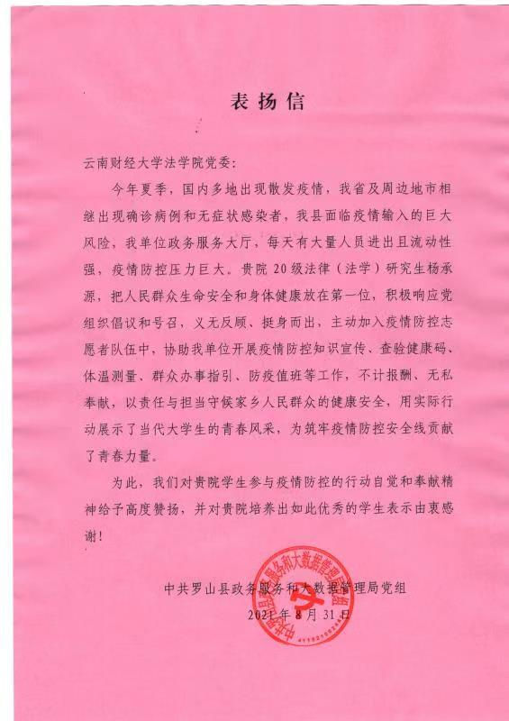 近日,法学院党委收到一份来自罗山县政务和大数据管理局党组、共青团罗山县委员会的表扬信。信中对我院法律硕士第一党支部的研究生杨承源同学在信阳市罗山县疫情防控期间参与疫情防控志愿服务的行为表示肯定和赞扬。同时,罗山县政务和大数据管理局党组、共青团罗山县委对我院学生参与疫情防控的行动自觉和奉献精神给予高度赞扬,并对我院培养出如此优秀的学生表示由衷感谢!