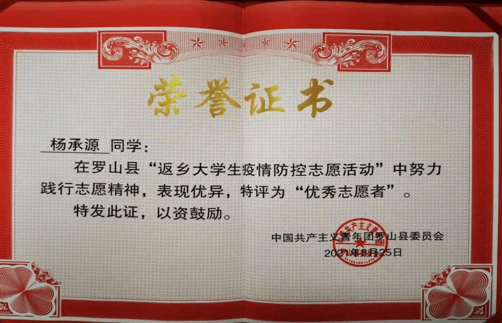 今年夏季,河南多地突发新冠疫情,并持续蔓延,我院法律硕士第一党支部的入党积极分子20级研究生杨承源同学的家乡紧邻疫情高风险地区,面临着疫情输入的巨大风险,防控形势十分严峻。作为家乡青年大学生的一员,杨承源同学在共青团罗山县委员会的号召下,积极参与家乡的防疫志愿服务活动,并积极承担社会责任。