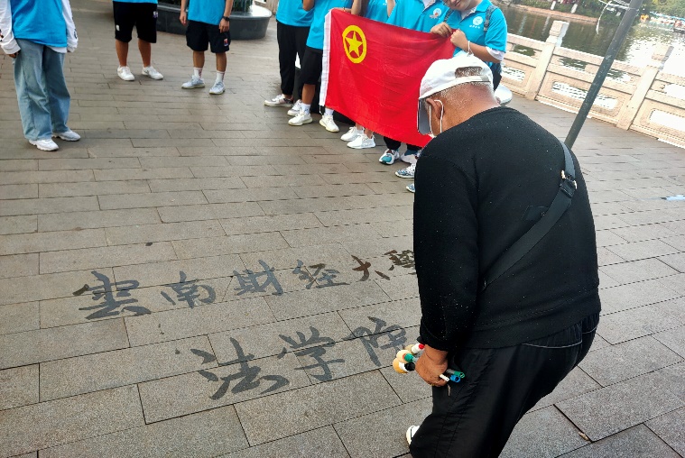 活动总结结束后,队员们以美丽的翠湖为背景进行合影留念。在此过程中,一位老爷爷拿着一杆毛笔,沾着水在地上写下了“WilliamHill官方网站法学院”九个大字,使得法学院“三下乡”实践队的队员们心潮澎湃。