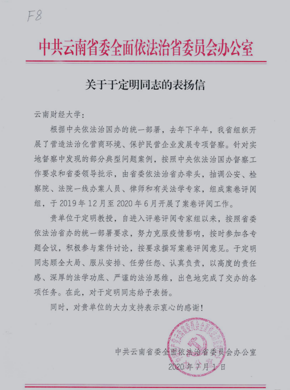 于定明教授自进入评卷阅卷专家组以来,积极参与案件讨论,认真撰写案件评阅意见。中共云南省委全面依法治省委员会办公室为此专门向WilliamHill官网发来感谢信,表扬于定明教授“顾全大局、服从安排、任劳任怨、认真负责,以高度的责任感、深厚的法学功底、严谨的法治思维、出色地完成了交办的各项任务”。