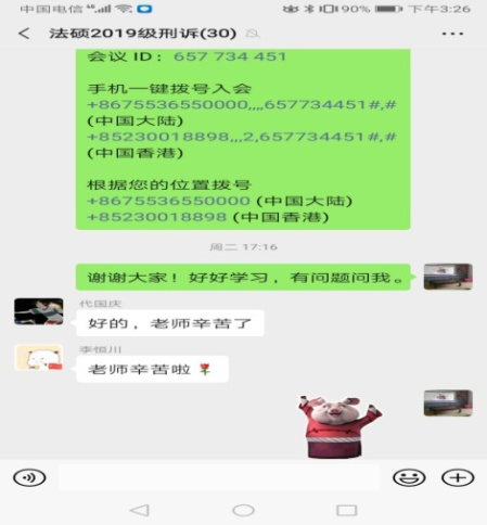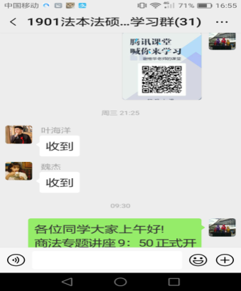谢维华老师担任2019级法本法硕《商法专题讲座课程》,在上课之前学习了雨课堂的操作流程,在儿子的鼎力帮助下选用雨课堂、腾讯课堂、腾讯会议三个平台进行试教,同时学习近期开放的商法课程借鉴经验。在上课前建立了课程微信群,推送中国政法大学赵旭东教授讲授的商法学供同学学习,推送了第一讲的参考文献供同学阅读,并在微信群里征求同学对网课平台的接受程度,决定选用腾迅课堂直播教学,腾讯会议作备选。授课采用直播形式,开课前进行了一次签到,临近结束又签了一次,直播效果还不错,课后在微信群里跟同学进行了交流。