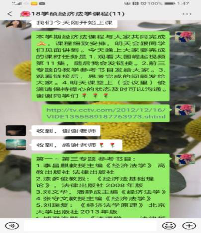 马慧娟副院长担任专业硕士与学术硕士《经济法专题》与《经济法学》课程教学。在前期的教学准备过程中,测试多个教学平台后确定“腾讯会议”进行直播教学,同时建立课程教学微信群。线上课程课程教学中,釆用了教学之前、之中、之后的“三环节把控法”确保教学活动顺利开展。具体方法即课程之前,与学生充分沟通交流教学方法细节,明确教学任务;并推送视频、参考书目和相关材料。课程之中,注重教学重点与难点的启发和互动。课程之后,注重收集相关问题与建议,并提示下一次课程的内容与难点。课程完成,对于新的教学方式,同学们表示课程信息量大、关注面广,这样的教学方式循循善诱又生动活泼,学生们一声声谢谢老师,表达了更加投入学习和喜欢这教学方式的声音。