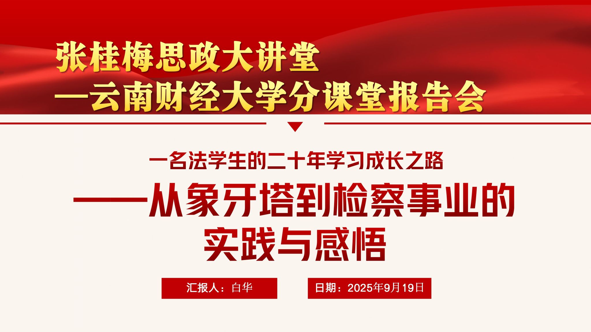 为深入学习贯彻习近平法治思想,教育引导法科学生筑牢法治信仰,坚守法律人的初心使命,9月19日下午“张桂梅思政大讲堂WilliamHill官方网站分课堂”邀请全国模范检察官、四川省攀枝花市米易县人民检察院党组书记、检察长白华校友在北院汇文礼堂作专题报告。学校宣传部副部长蒋见证、法政学院领导及近千名师生参加报告会。报告会由法政学院党委副书记、纪委书记张吟竹主持。