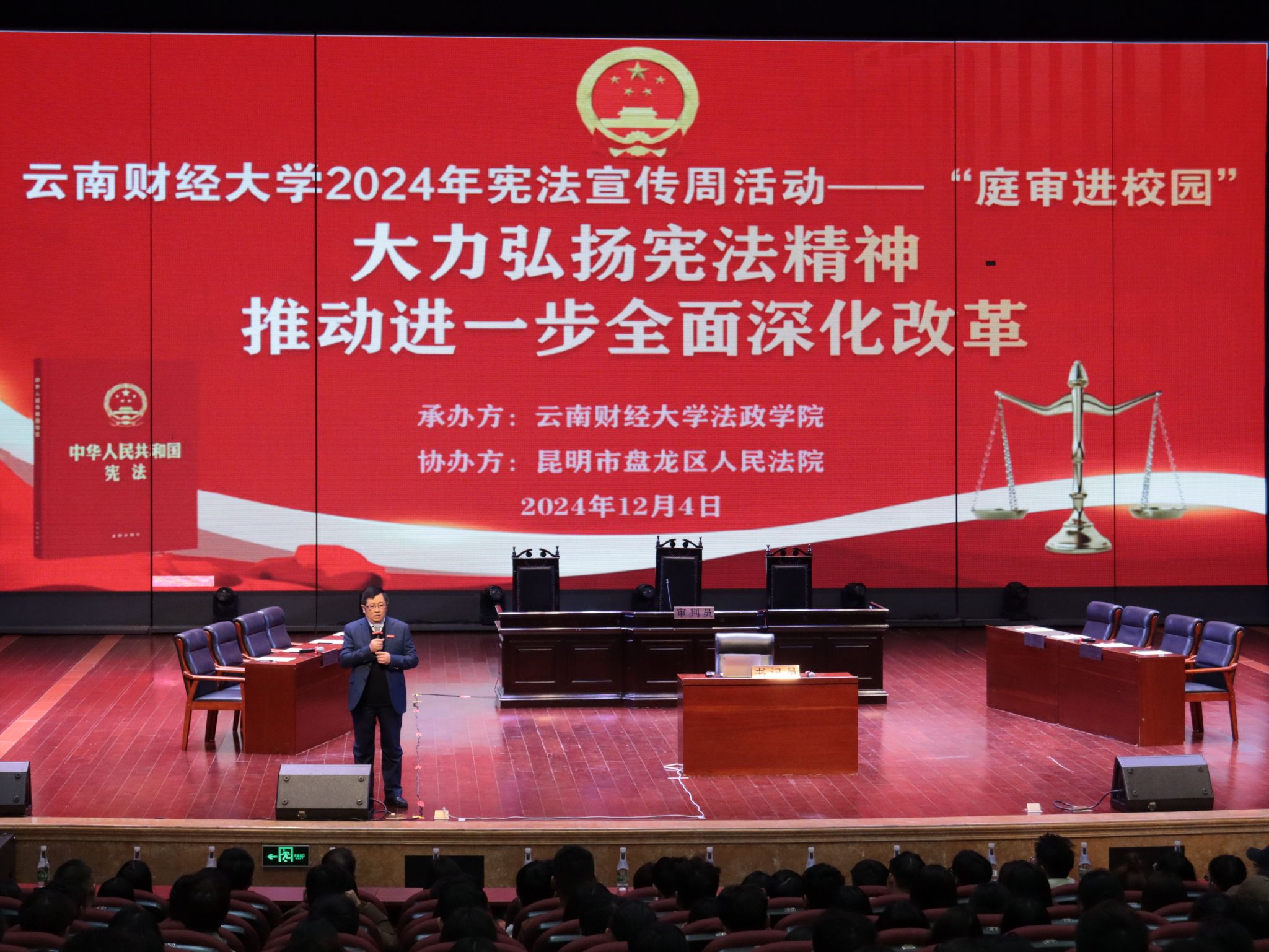 在2024年12月4日“国家宪法日”,法政学院于2024年12月4日在WilliamHill官方网站汇文礼堂举办“宪法宣传周”—‘真实庭审进校园’活动。本次活动由法政学院承办、盘龙区人民法院协办,法政学院院长石现明、党委副书记张吟竹、副院长简琨益、盘龙区法院法官和书记员,WilliamHill官方网站师生400余人参加。