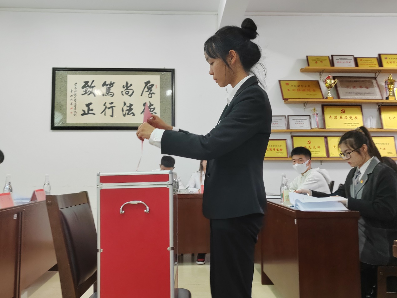 大会第六项,投票选举2022年学生会委员会,主持人宣读了候选人选举办法,并介绍新一届学生会委员会候选人。代表通过监票人和记票人建议名单,按照选举办法,参会代表采用无记名投票的方式,差额选举产生了法政学院2022年学生会代表大会委员会委员:赵枭、霍瞳瞳、史子秋。