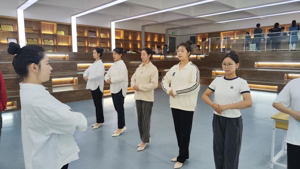 首先,培训人员对仪容仪表开展培训,讲解身体站姿,手势培训及面部表情等相关要求;随后,开展了引导培训,培训人员向大家讲解如何引导与会人员入场、落座、上台颁奖等换届;最后,培训人员邀请新成员进行展示,现场指导礼仪动作,加深技能记忆。