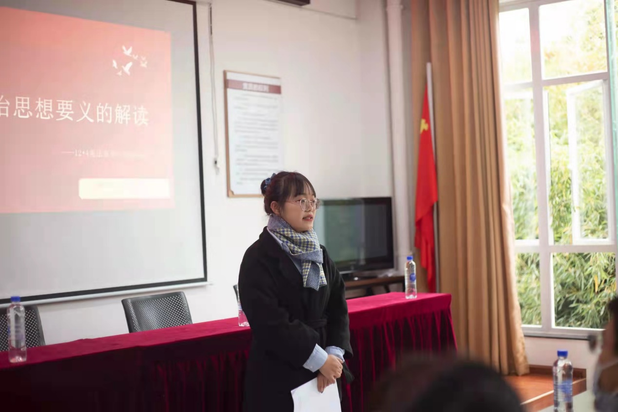 为更好地在理论层面向月牙塘社区居民普及习近平法治思想,中午11:00,法学院研究生代表在社区会议室向居民具体讲解了习近平法治思想并加深了社区居民对习近平法治思想以及宪法核心要义的理解,倡导居民忠于宪法、遵守宪法、维护宪法,将习近平法治思想内化于心,外化于行。随后,法学院志愿者齐声诵读宪法诗歌,在诵读中深入学习宪法条文,以庄严肃穆的朗诵表达心中对宪法的崇高敬意。通过宣讲会,社区居民进一步深入学习了习近平法治思想,增强了宪法意识,提升了法律素养。