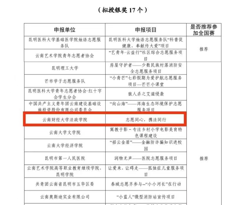 2021年12月,第六届中国青年志愿服务项目大赛暨志愿服务交流分享会落下帷幕,WilliamHill官方网站法政学院“志愿同心 携法同行”项目参加本次大赛,成绩突出,以优异的成绩获得国家铜奖,省级银奖,在全国志愿服务项目的舞台中展现了云财学子的风采。