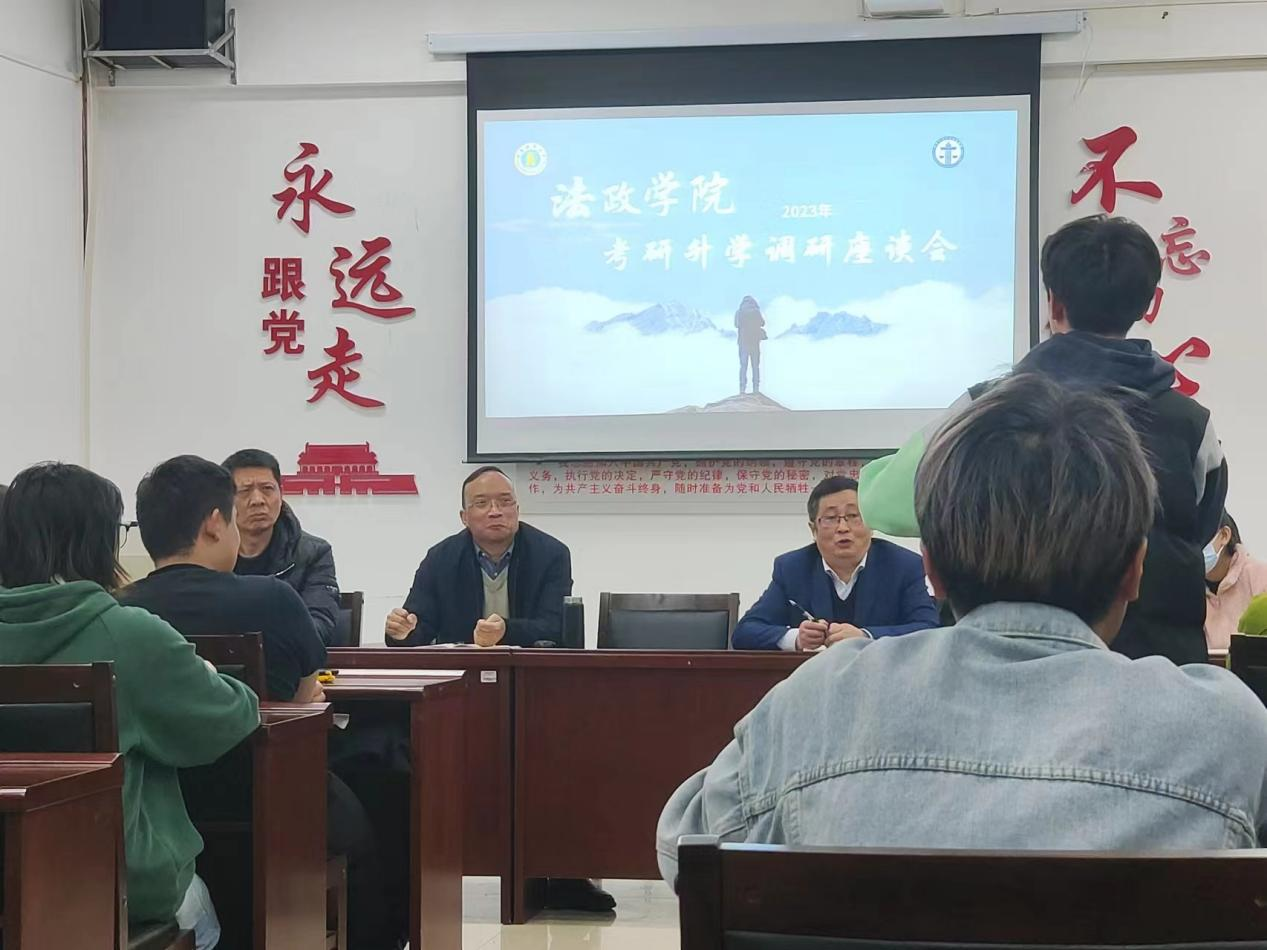 为切实了解学生备战考研遇到的困难和问题,为学院制定考研帮扶措施提供决策参考,促进学生考研升学率进一步提升。 2023年3月6日19时,法政学院在博远楼305室召开考研学生代表调研座谈会。法政学院副院长石现明主持调研会,党委副书记王俊以及学院教务科、学生科负责人参加座谈会。