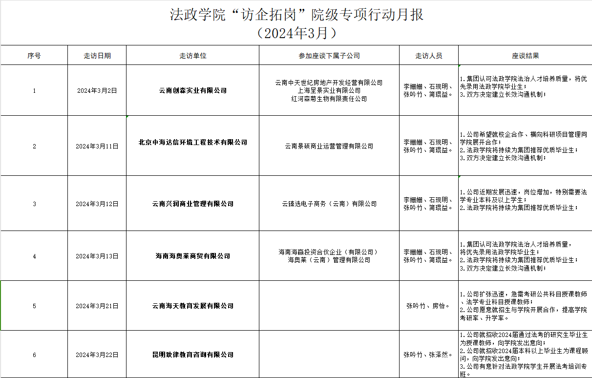 院级访企拓岗专项行动小组走访了云南创森实业有限公司、北京中海达信环境工程技术有限公司、云南兴润商业管理有限公司、海南海奥莱商贸有限公司、云南海天教育发展有限公司、昆明致律教育咨询有限公司及相关集团公司下属分子公司,结合学院专业人才培养特点和走访单位业务方向,积极开展岗位拓展和人才推荐对接,在开展校园招聘、邀请企业进校举办就创业讲座、强化求职相关技能培训力度方面与用人单位达成合作意向。
