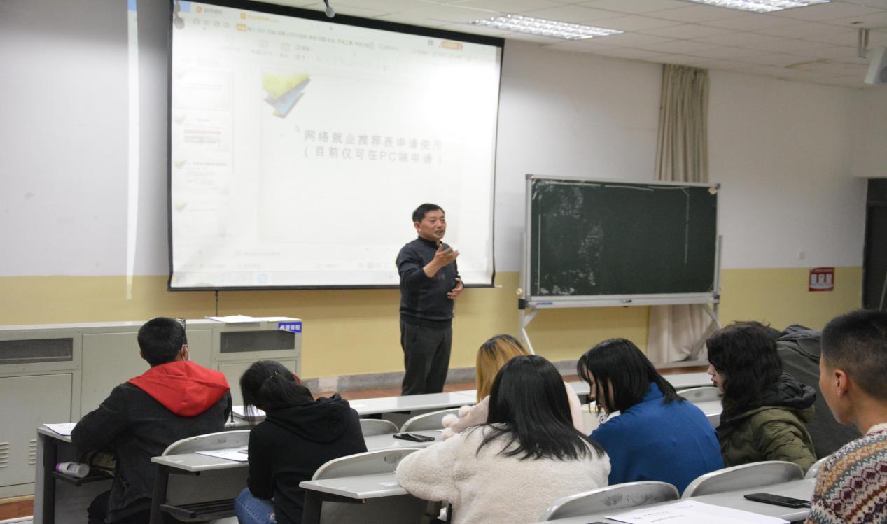 余登贵针对毕业生相关工作做了安排,对毕业生档案转接、云就业平台的操作进行培训,为毕业生准确填报就业信息、网上签订三方协议等内容进行了有效指导。