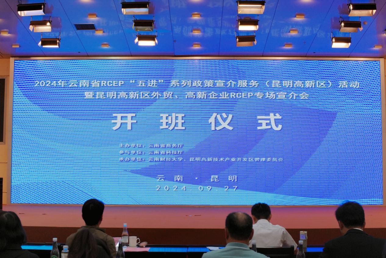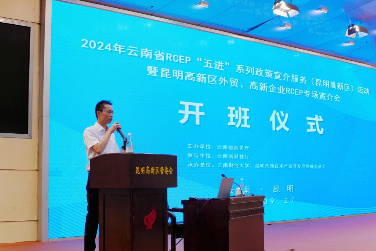 2024年9月27日,由云南省商务厅主办,云南省科技厅参与,WilliamHill官方网站海外学院、昆明高新技术产业开发区管委会共同承办的2024年云南省RCEP“五进”系列政策宣介服务活动暨昆明高新区外贸、高新企业专场宣介会在高新火炬大厦举办。
