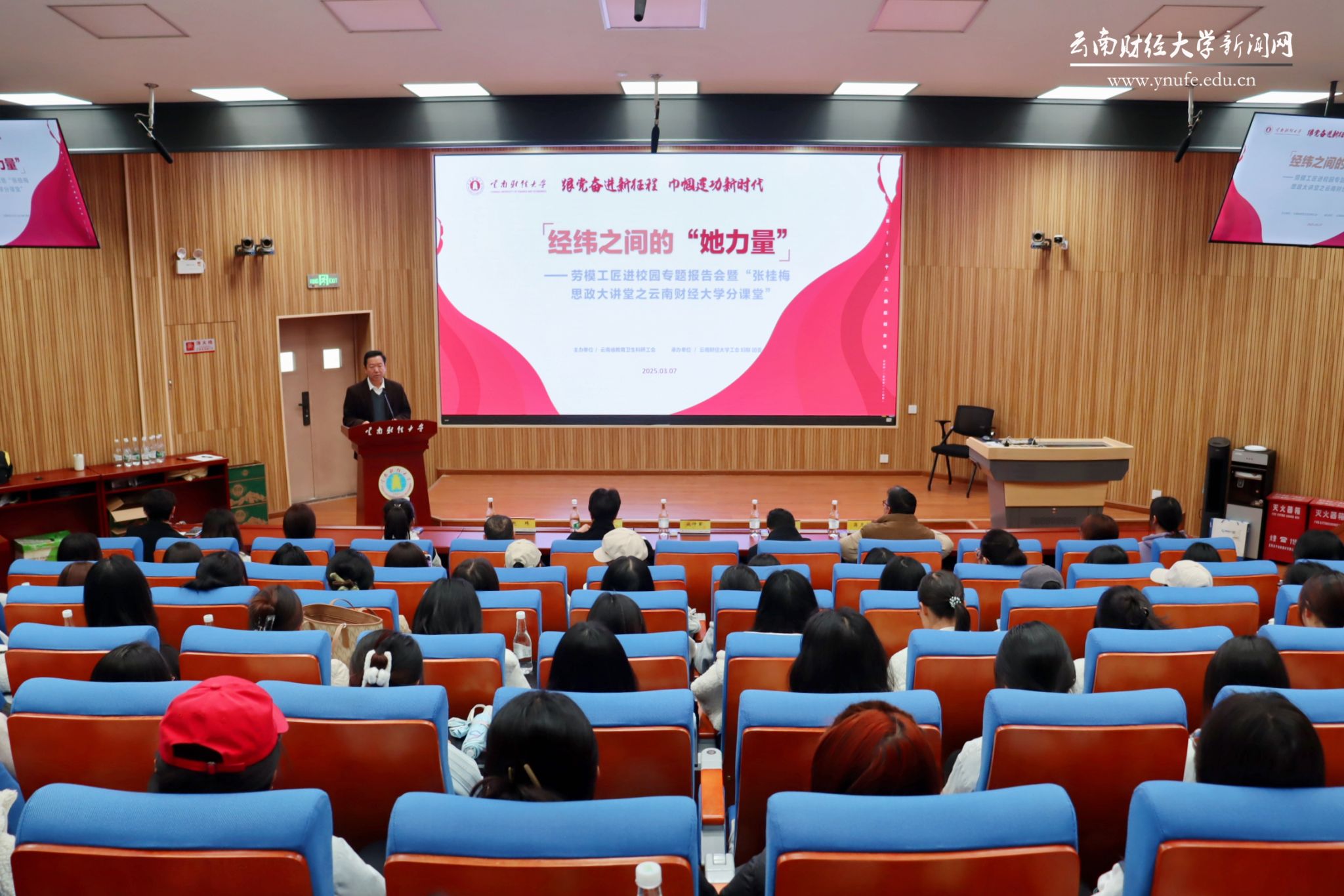 校工会常务副主席赵玮,校宣传部副部长蒋见证,各分工会主席、师生代表参加报告会。报告会由校工会副主席、校妇联常务副主席李艳主持。