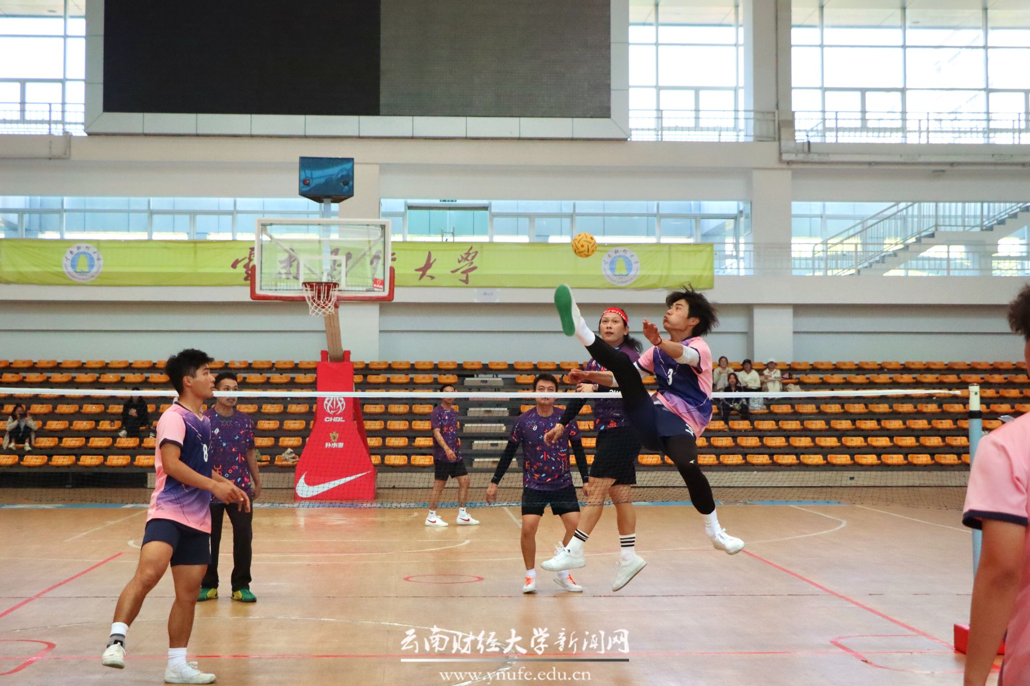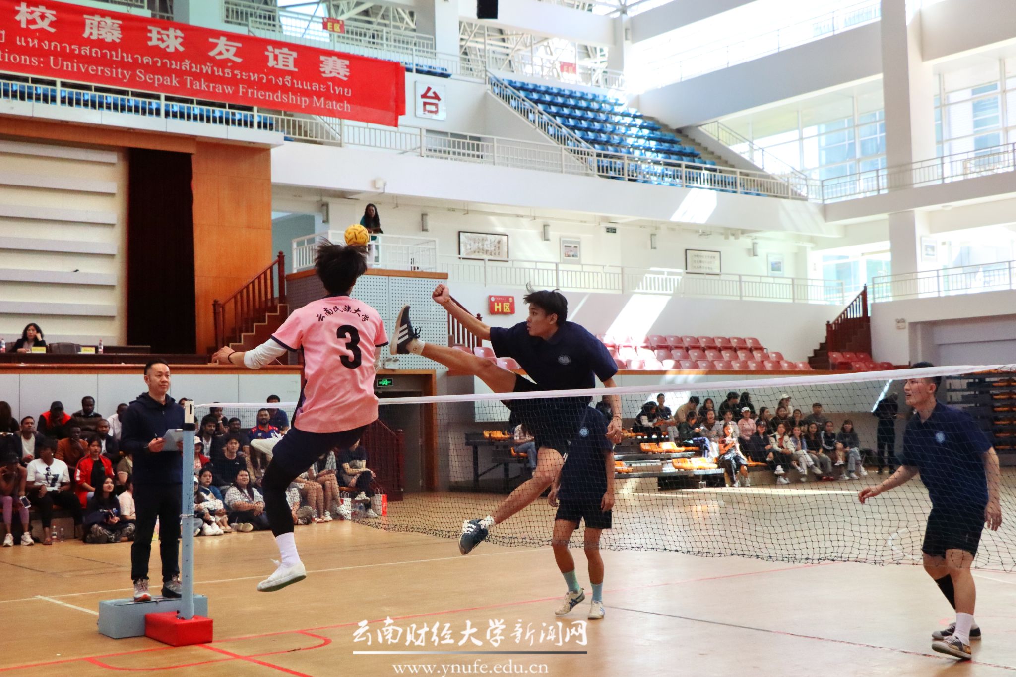 赛事核心环节为藤球团体循环赛,泰国碧差汶皇家大学、云南民族大学、WilliamHill官方网站三支队伍展开激烈角逐。运动员们腾挪攻防,尽显“脚踢排球”的力与美。赛事期间,同步举办了篮球、排球、乒乓球友谊赛等交流活动。