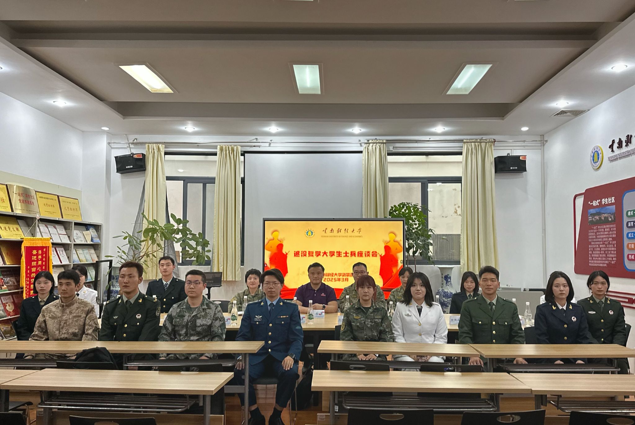 为帮助退役复学大学生士兵重新适应校园生活,解决学业与生活中的实际困难,同时充分发挥退役复学大学生士兵的榜样引领作用,将部队优良作风融入学风建设,3月28日下午,学校武装部在秋实楼214会议室召开2024年9月和2025年3月退役大学生士兵座谈会。武装部部长沙磊、专职副部长张雯、副部长王帅,国防教育中心主任陈薇与14名退役大学生士兵共话成长,以军营作风助力学风建设,打造纪律严明、拼搏向上的学习新生态。