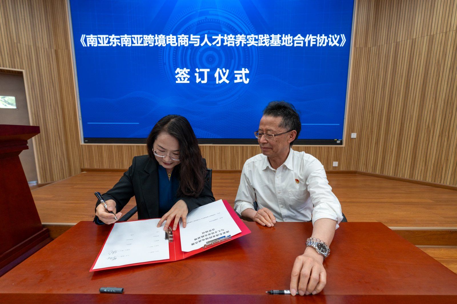 国际语言文化学院院长刘代容、云南省地理标志产业协会党委书记樊德明代表双方签订合作协议,校企双方将在此基础上启动跨境电商微专业建设等相关工作。