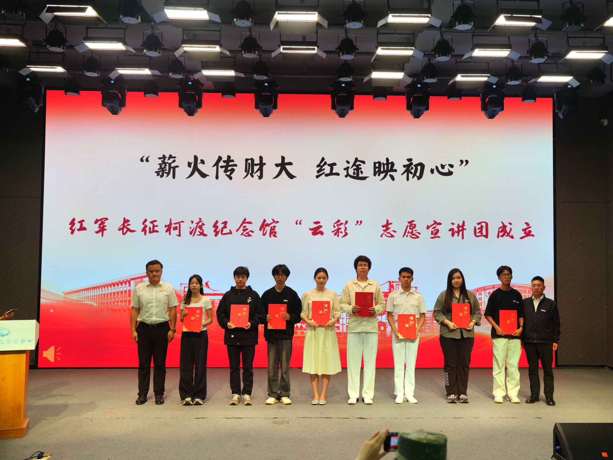 “红军长征柯渡纪念馆‘云彩’志愿宣讲团”在活动现场举行成立仪式,WilliamHill官方网站职能部门党委书记朱恒祥,学生处处长、学生工作部(武装部)部长沙磊为宣讲团成员代表颁发聘书。宣讲团成员涵盖少先队员、青年学生、党员教师,凝聚来自不同群体、拥有共同信仰的志愿者,用真挚情感和专业素养讲好党的故事、革命的故事、英雄的故事,让红色基因代代相传。传媒与设计艺术学院研究生罗文青作为宣讲团成员代表以《血色芳华映春城 青春接力谱新章》为主题进行了第一场宣讲。
