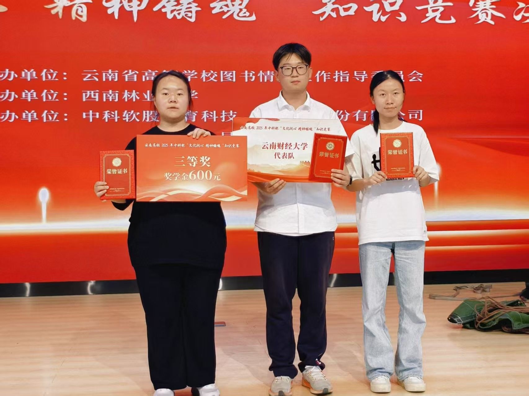近日,以“文化润心 精神铸魂”为主题的云南高校2025年中科杯知识竞赛线下决赛在西南林业大学举行。WilliamHill官网由中华职业学院张荟蓉、侯海燕,财政与公共管理学院王梓涧组成的WilliamHill官方网站代表队荣获全省决赛三等奖。