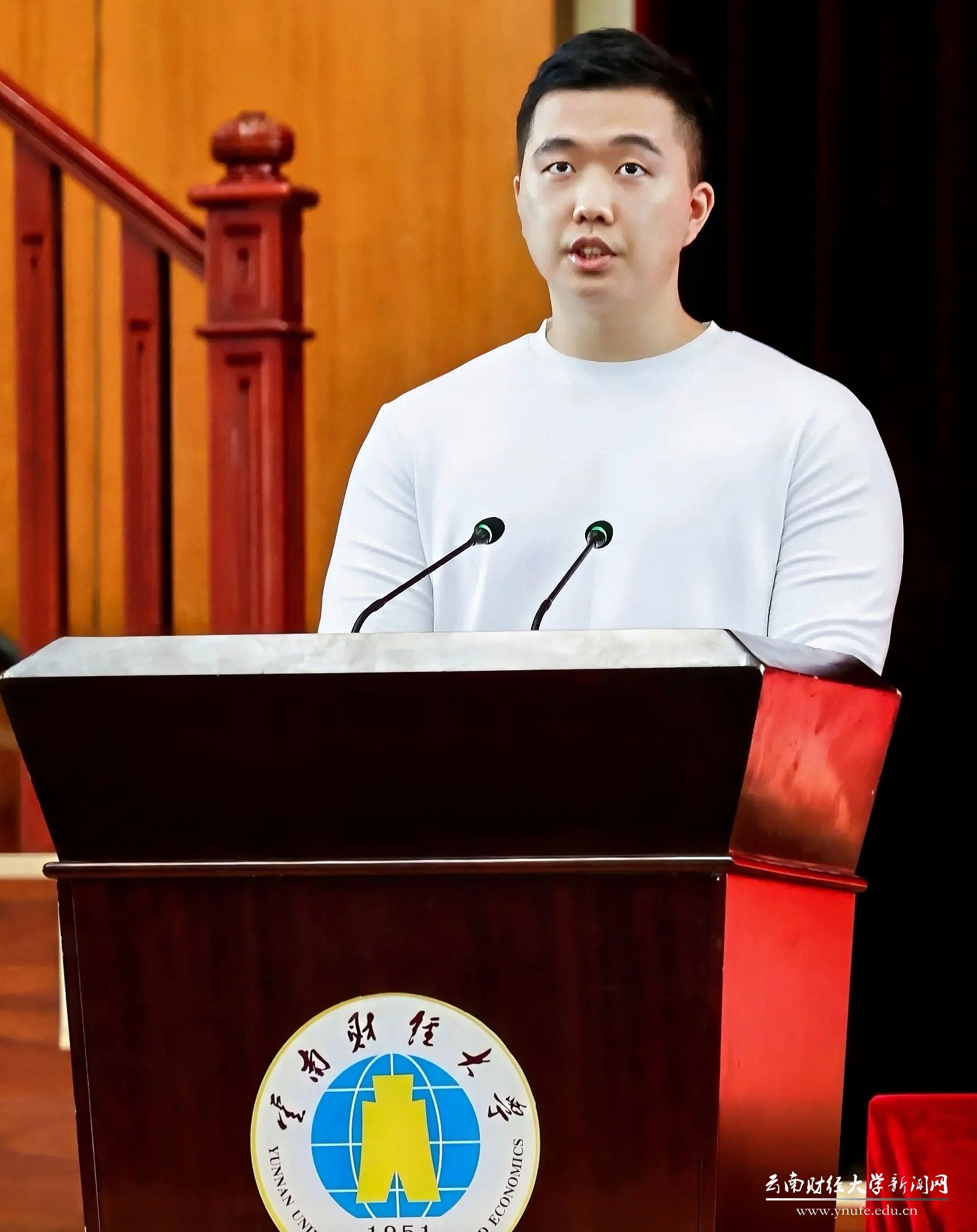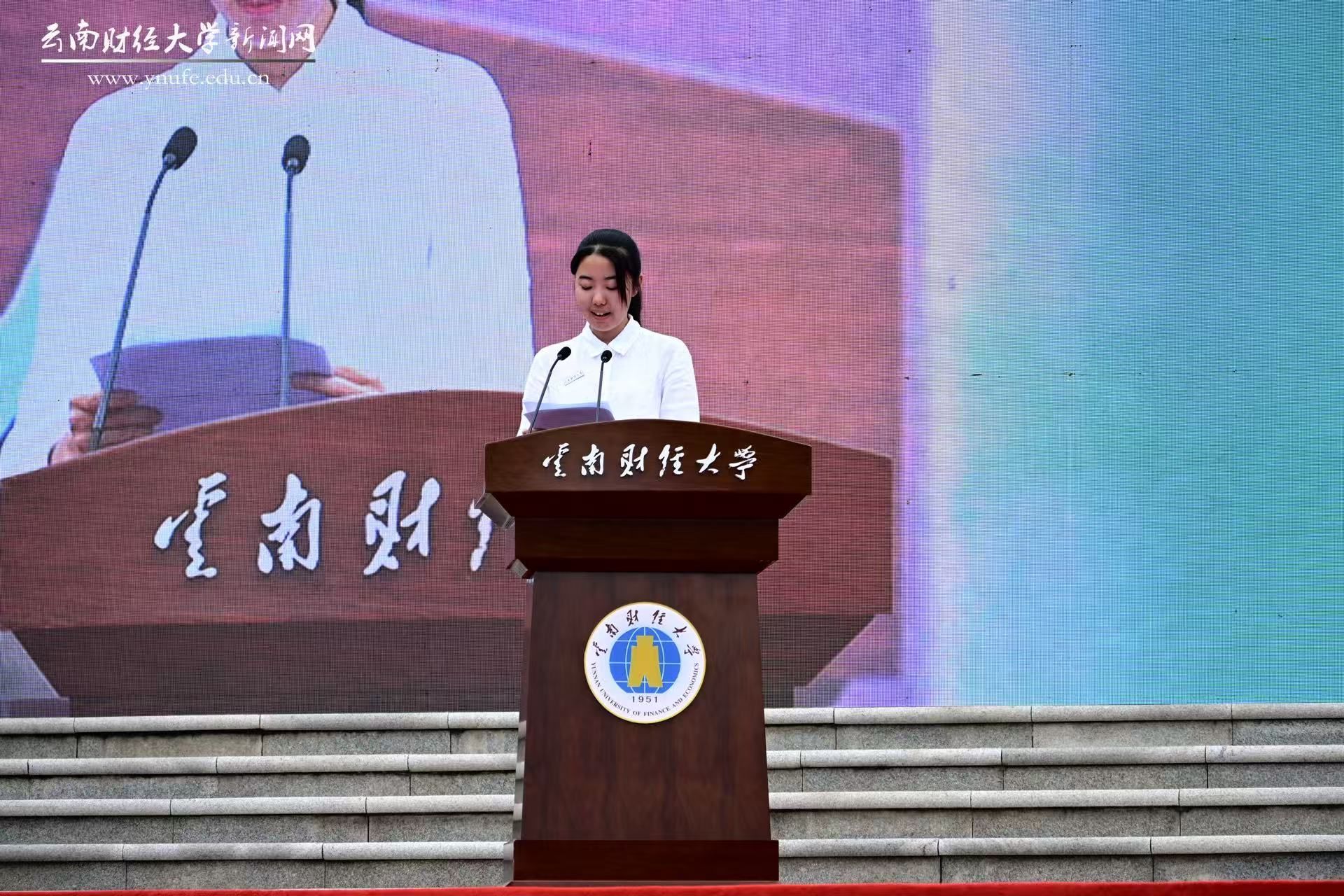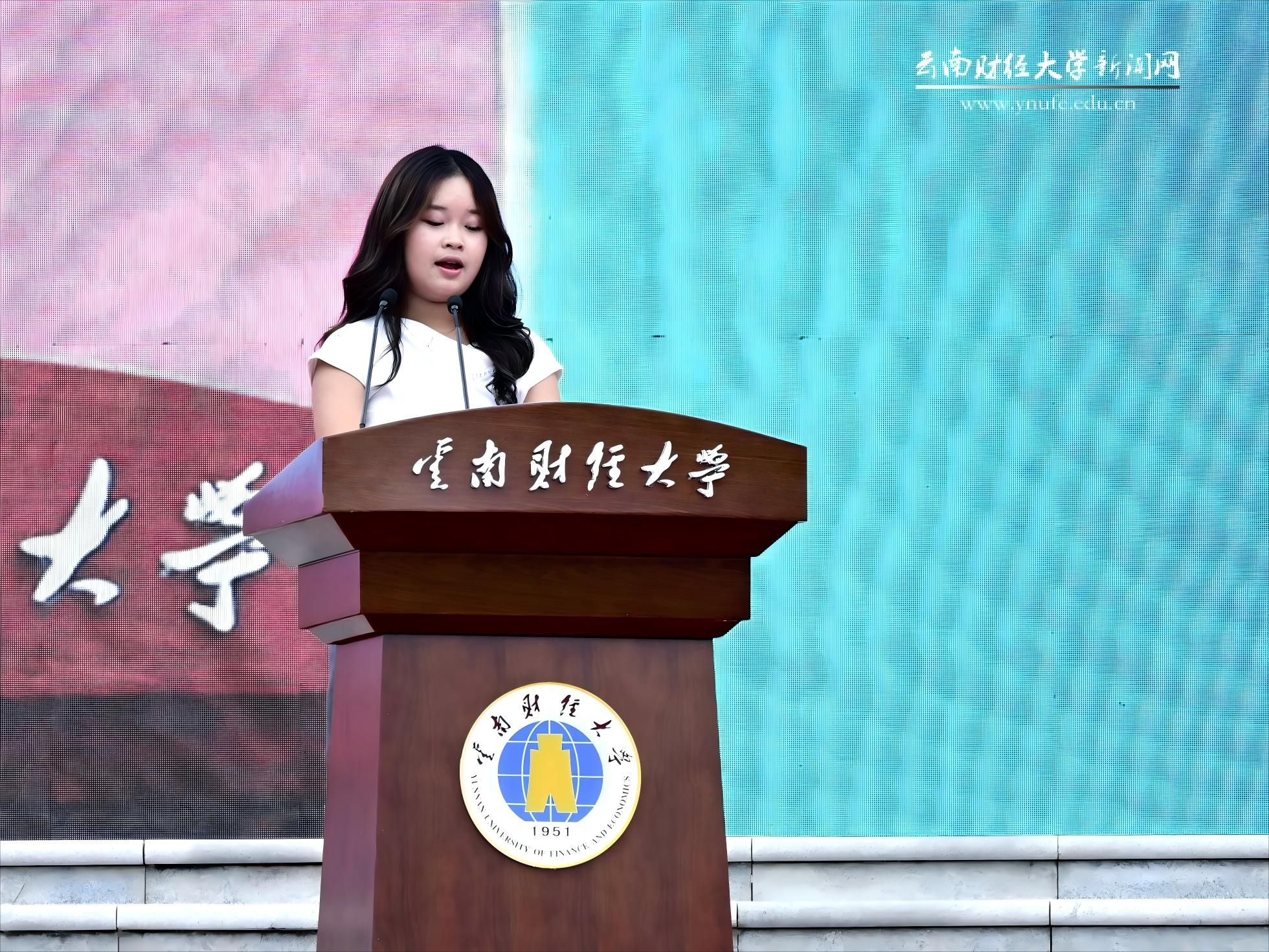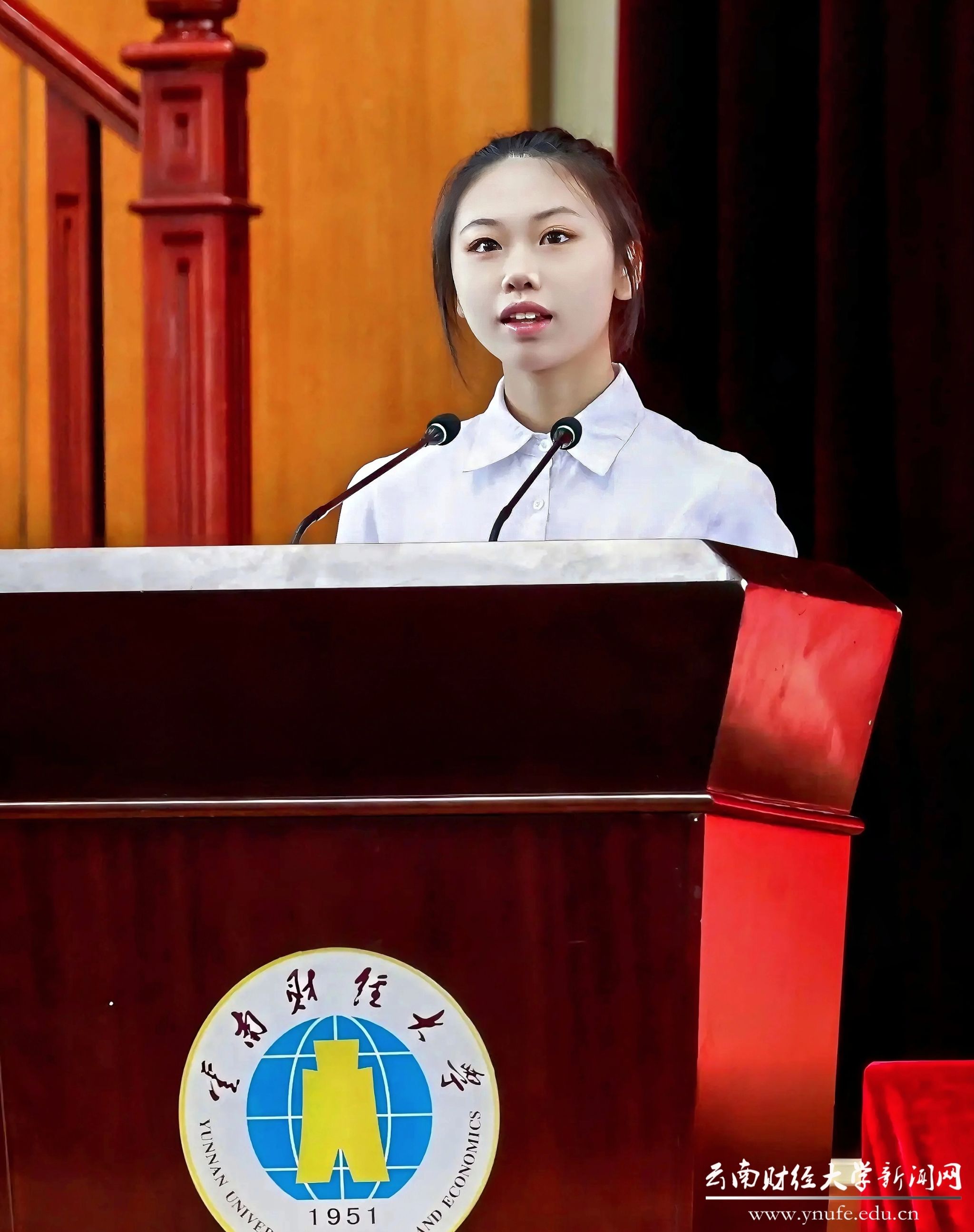 本科生代表、商学院孙诗萁和信息学院孙誉玲同学,研究生代表、经济学院邵白天渝和传媒与设计艺术学院游姗姗同学,国际学生代表、老挝籍本科新生苏潘迪同学分别发言。